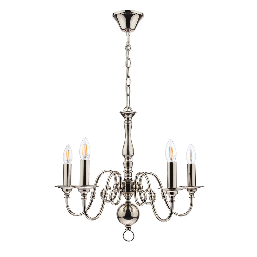 Type: Pendant | Finish: Polished Nickel | Lamp Holder: E14 (SES) | No. of Lamps: 5 | Max Wattage: 40W | Class: 1 - Earthed | Dimensions: H: 1625mm × Dia: 550mm × Min H: 650mm × Max H: 1625mm